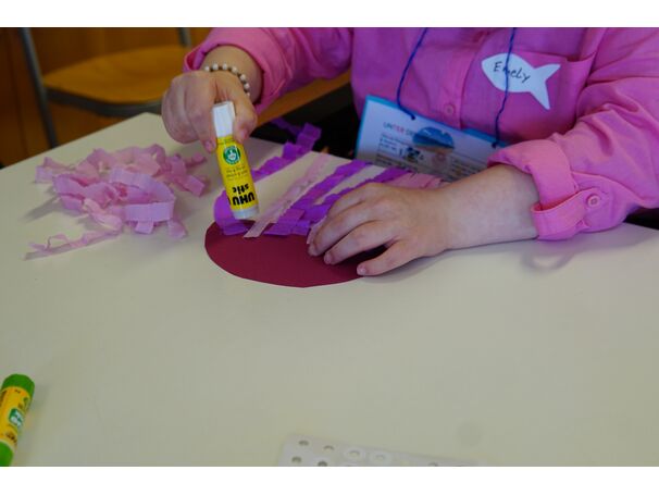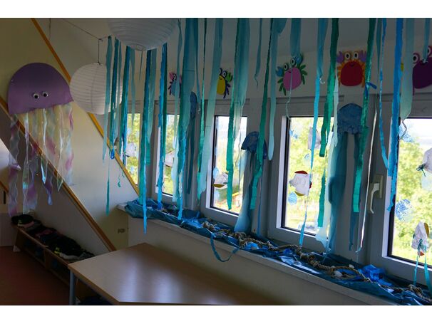 Nach einer gemeinsamen Begrüßung auf dem Schulhof konnten die Kinder und Jugendlichen an vielen Stationen ihre Sinne entdecken und sich bewegen. Auf dem Programm standen eine basale Klanggeschichte mit anschließendem Slusheis, eine fantasievolle Bewegungslandschaft in der Turnhalle, Angelspiele im Softplayraum, entspannende Fußbäder in der Oberstufe („Wir laufen auf dem Meeresgrund“), eine „Unterwasserwelt“ im Snoezelraum, spannende Fühlboxen unter dem Titel „Meer erleben“, eine Bastelaktion, bei der bunte Quallen entstanden, sowie ein besonderer Höhepunkt in der Backstube der „Zauberer“: ein blauer Wackelpudding, dekoriert mit kleinen Elementen aus dem Meer.